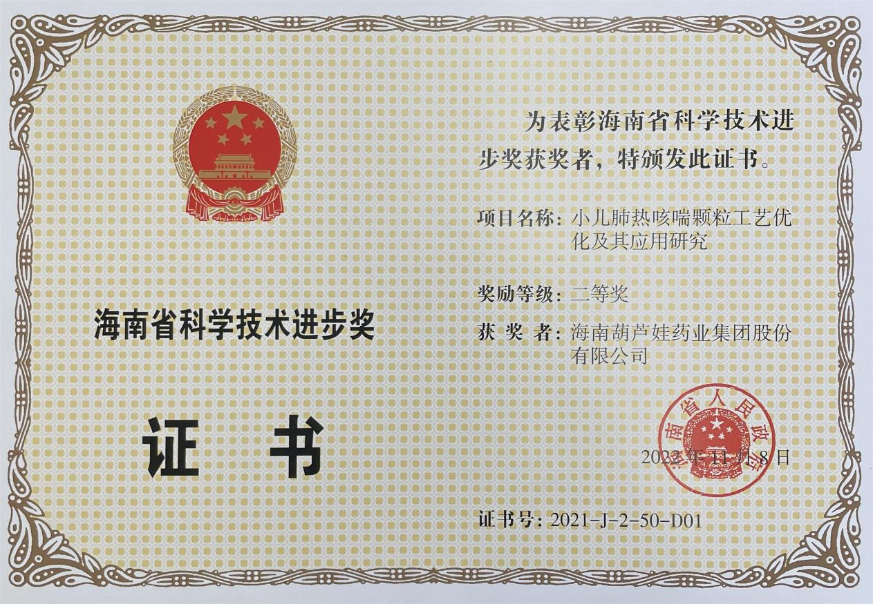 为此,小儿肺热咳喘颗粒的制备方法获得了第二十一届中国专利优秀奖(2019年),专利申请号:ZL201010134951,此次作为专利技术的应用,获得了2021年度海南省科学技术进步奖二等奖。在此之前,PG国际牌小儿肺热咳喘颗粒还多次被授予“临床价值中成药品牌”、“中国连锁药店最具合作价值单品”,荣登“中国医药品牌榜”。